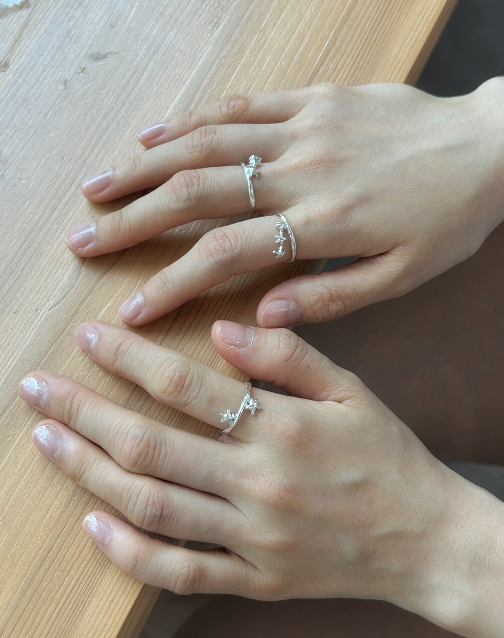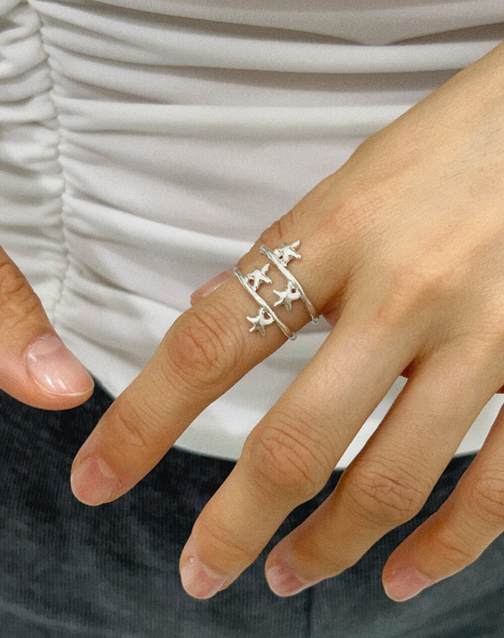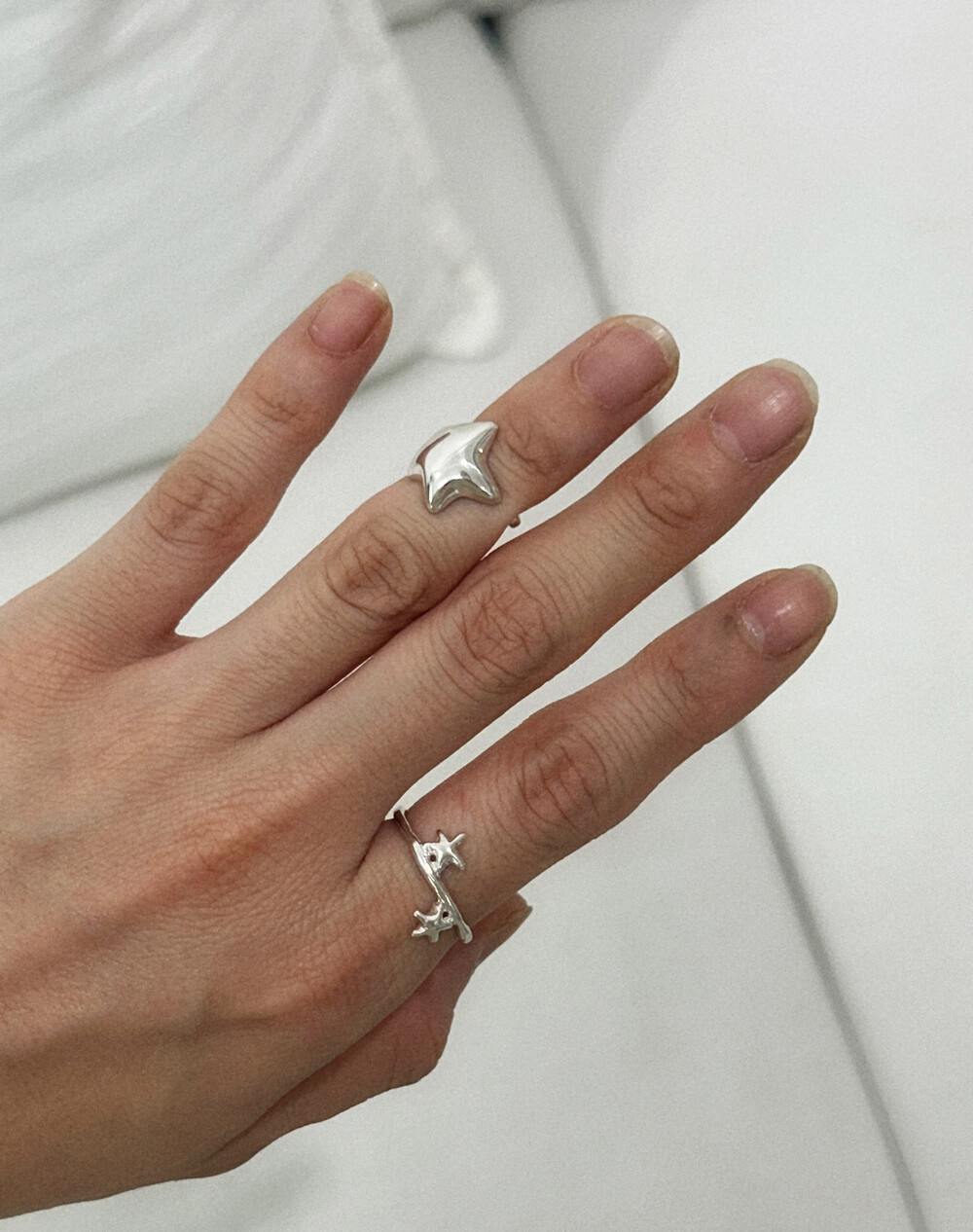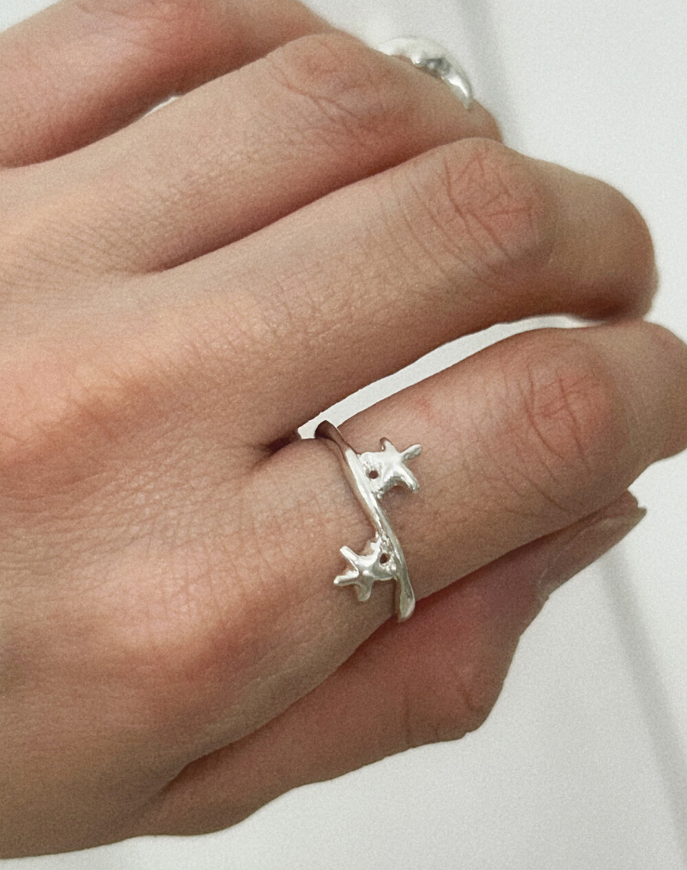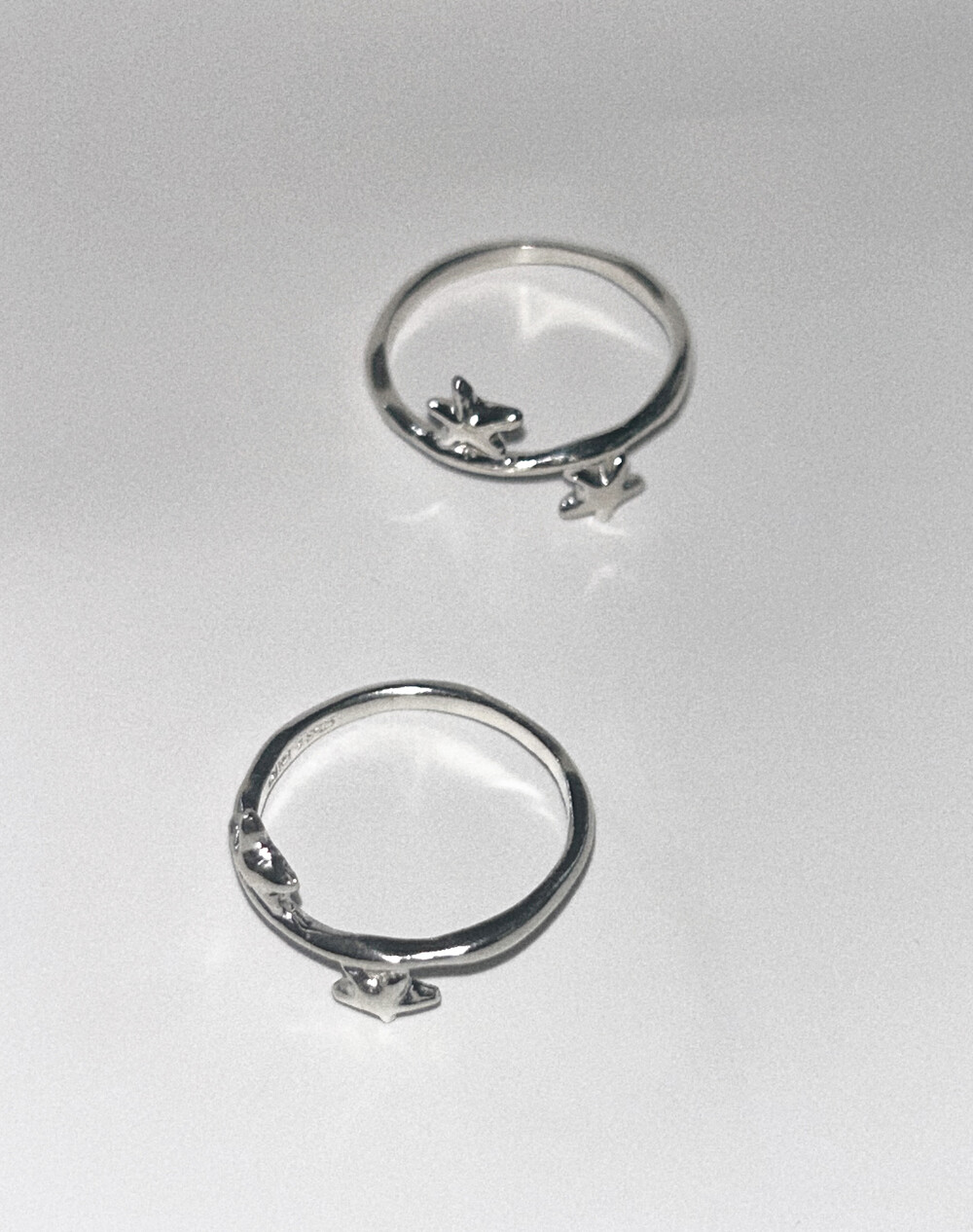 손가락 위, 작고 사랑스러운 두 개의 별이 마주 보며 손가락 위에서 빛나는 특별한 반지입니다.
