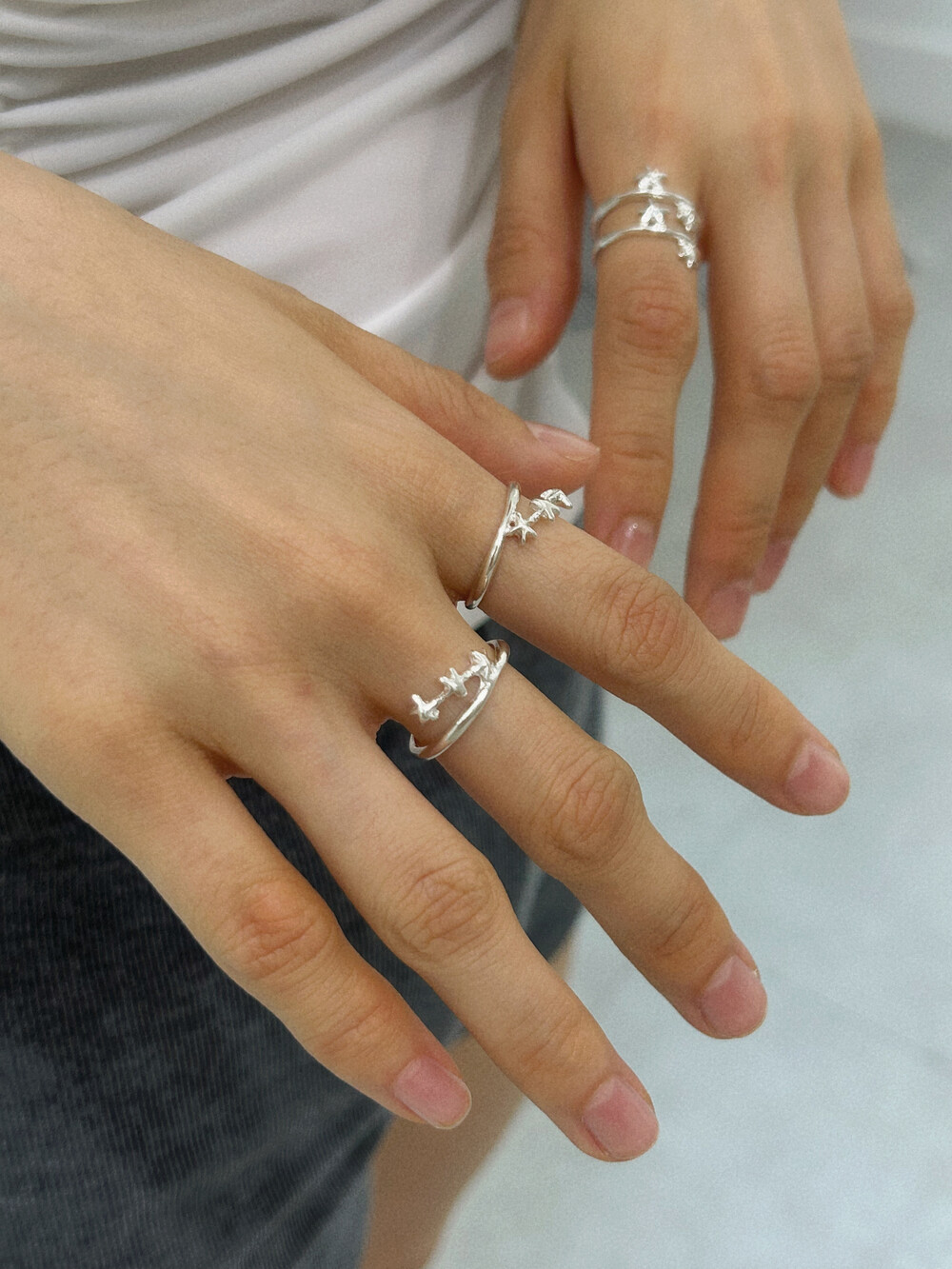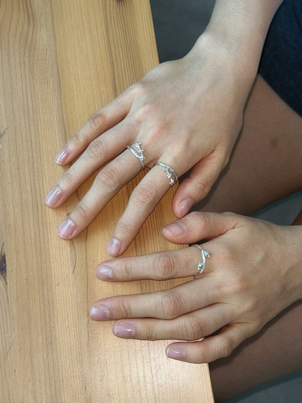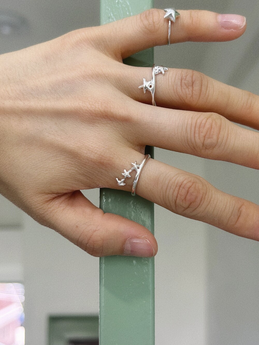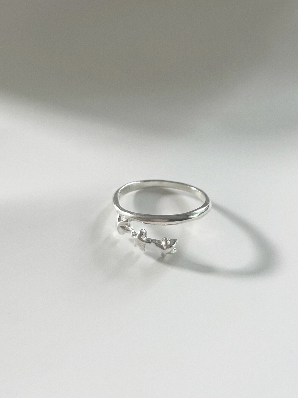 작은 별 세 개가 나란히 손을 잡고 이어진 듯한 이 반지는 은은한 볼륨감과 귀여운 별 배치가 포인트입니다. 별자리가 살짝 떠오르기도 해요.