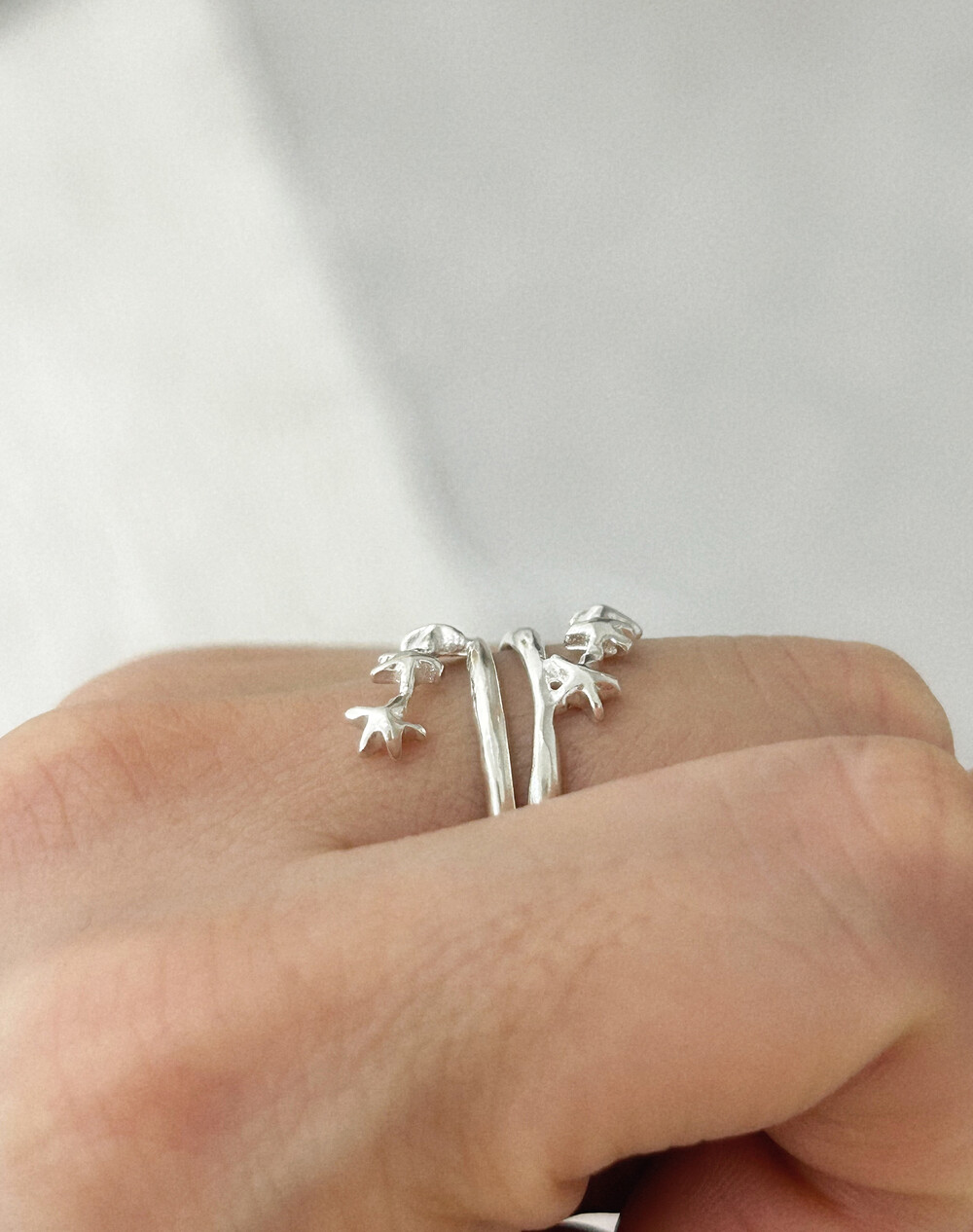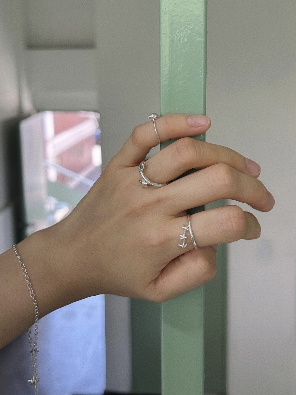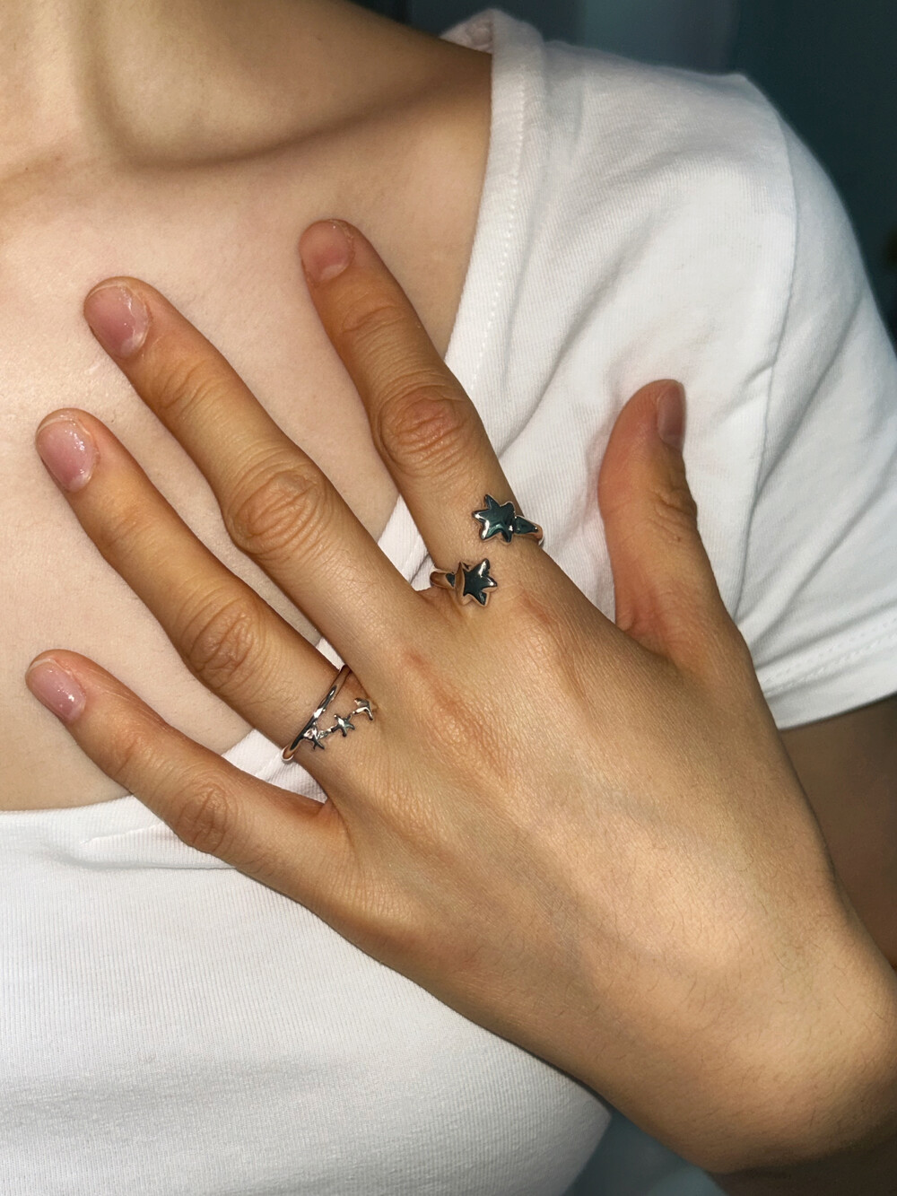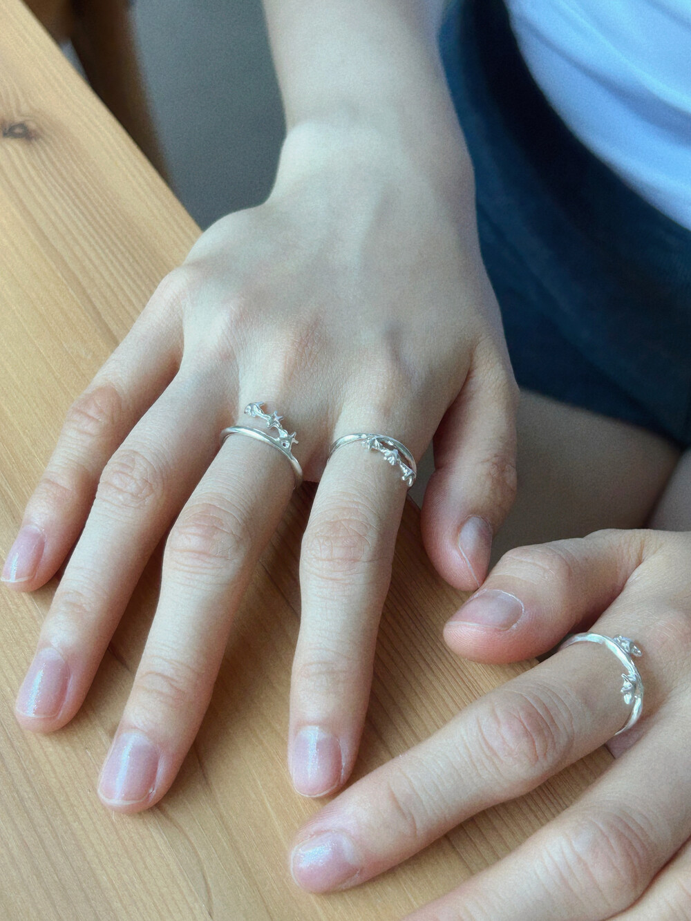 작은 별 세 개가 나란히 손을 잡고 이어진 듯한 이 반지는 은은한 볼륨감과 귀여운 별 배치가 포인트입니다. 별자리가 살짝 떠오르기도 해요.