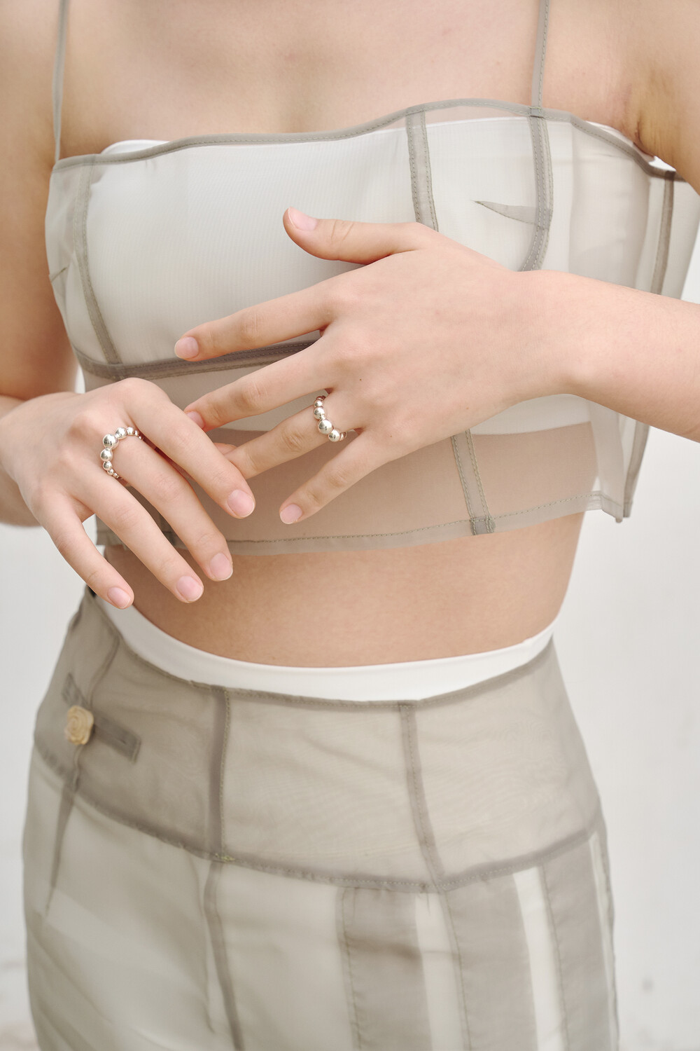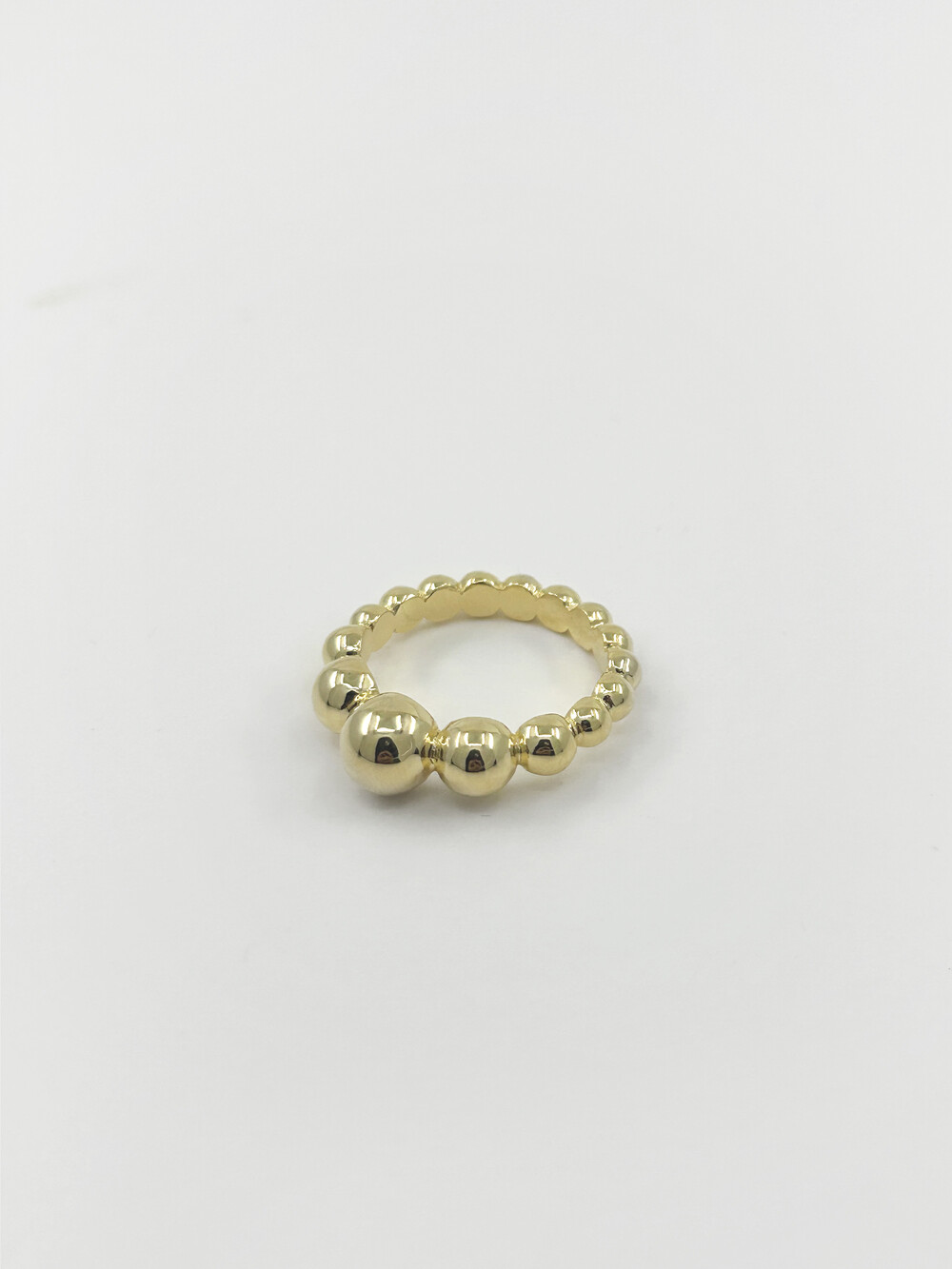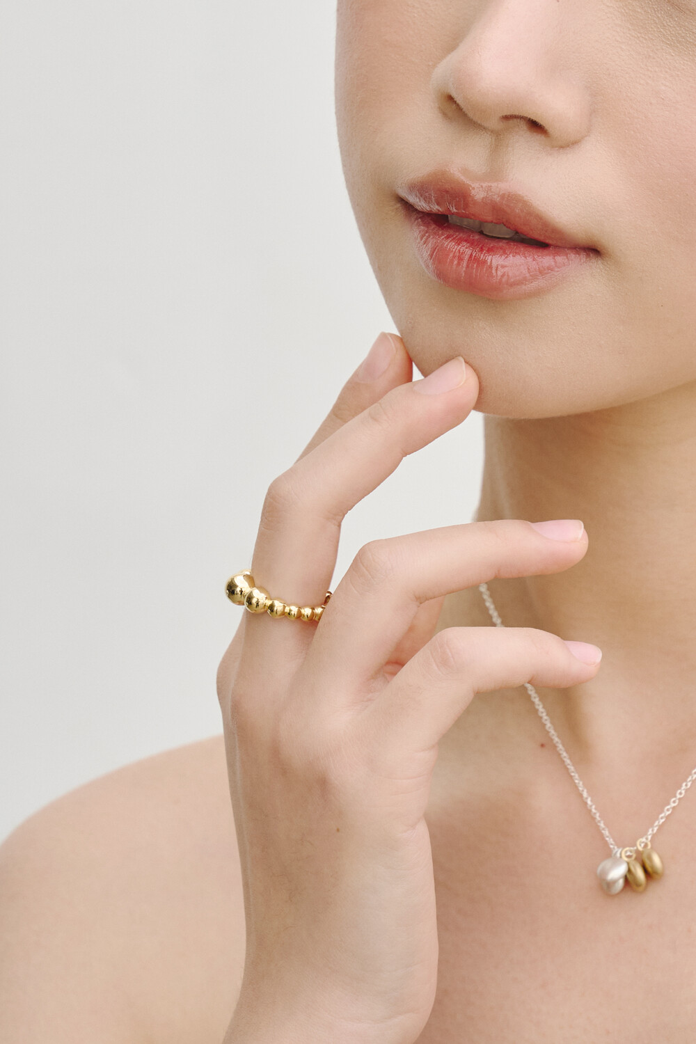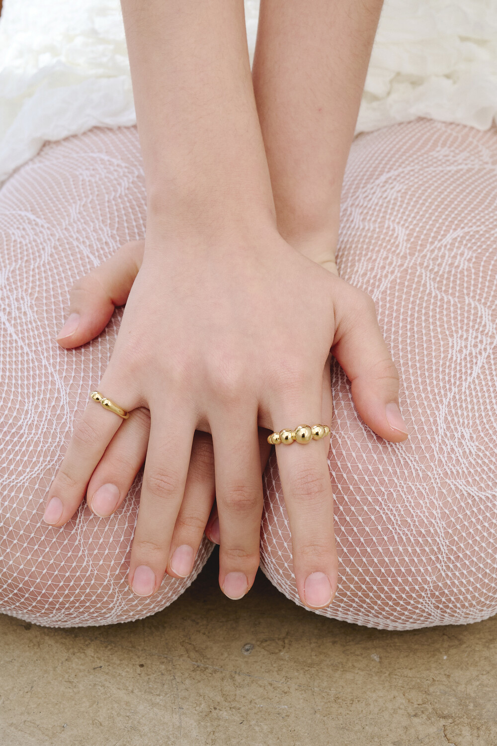 다양한 볼륨감 있는 볼들이 사랑스럽게 줄지어 있는 러블리한 반지입니다. 부드러운 광이 매력적인 포인트 반지입니다.